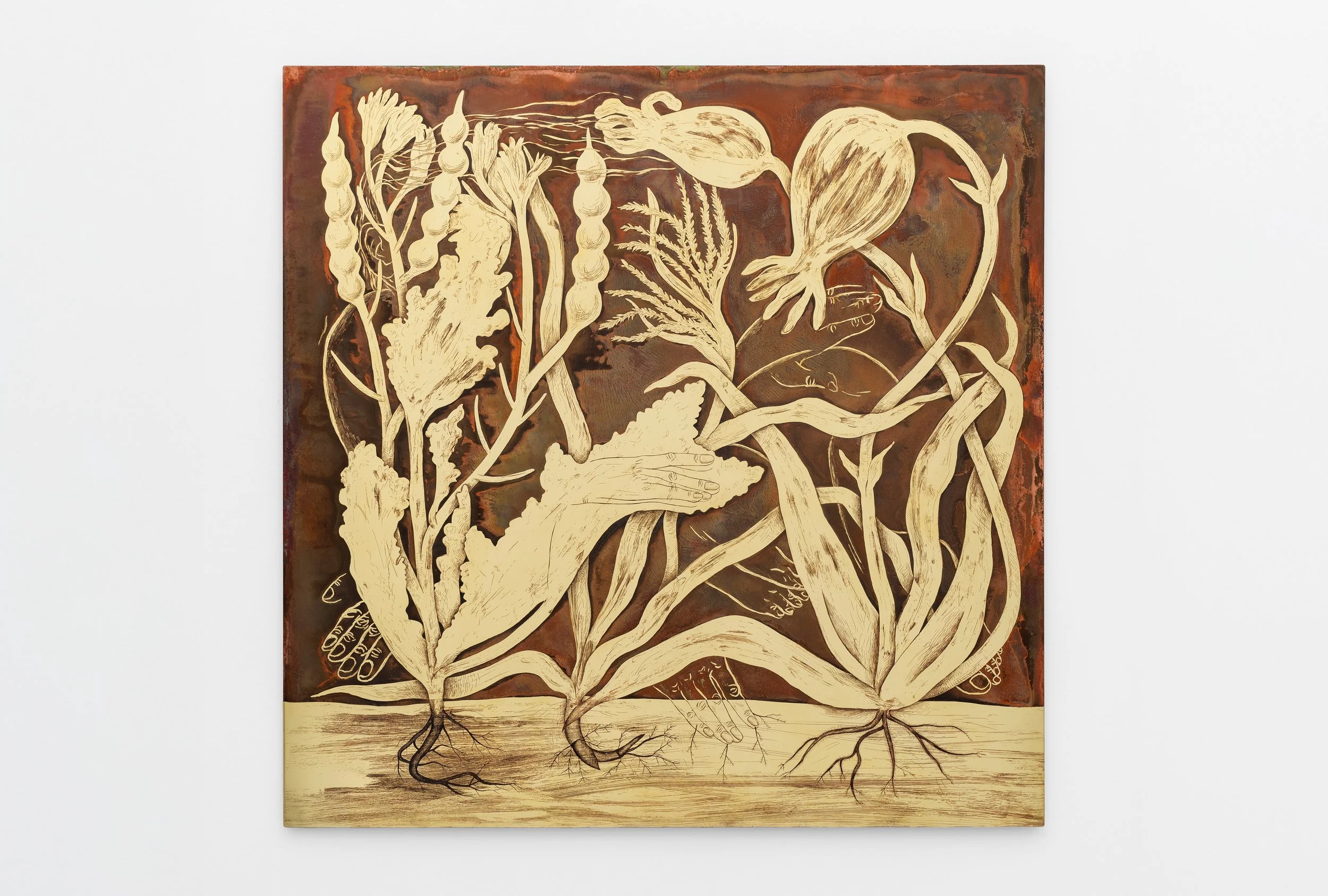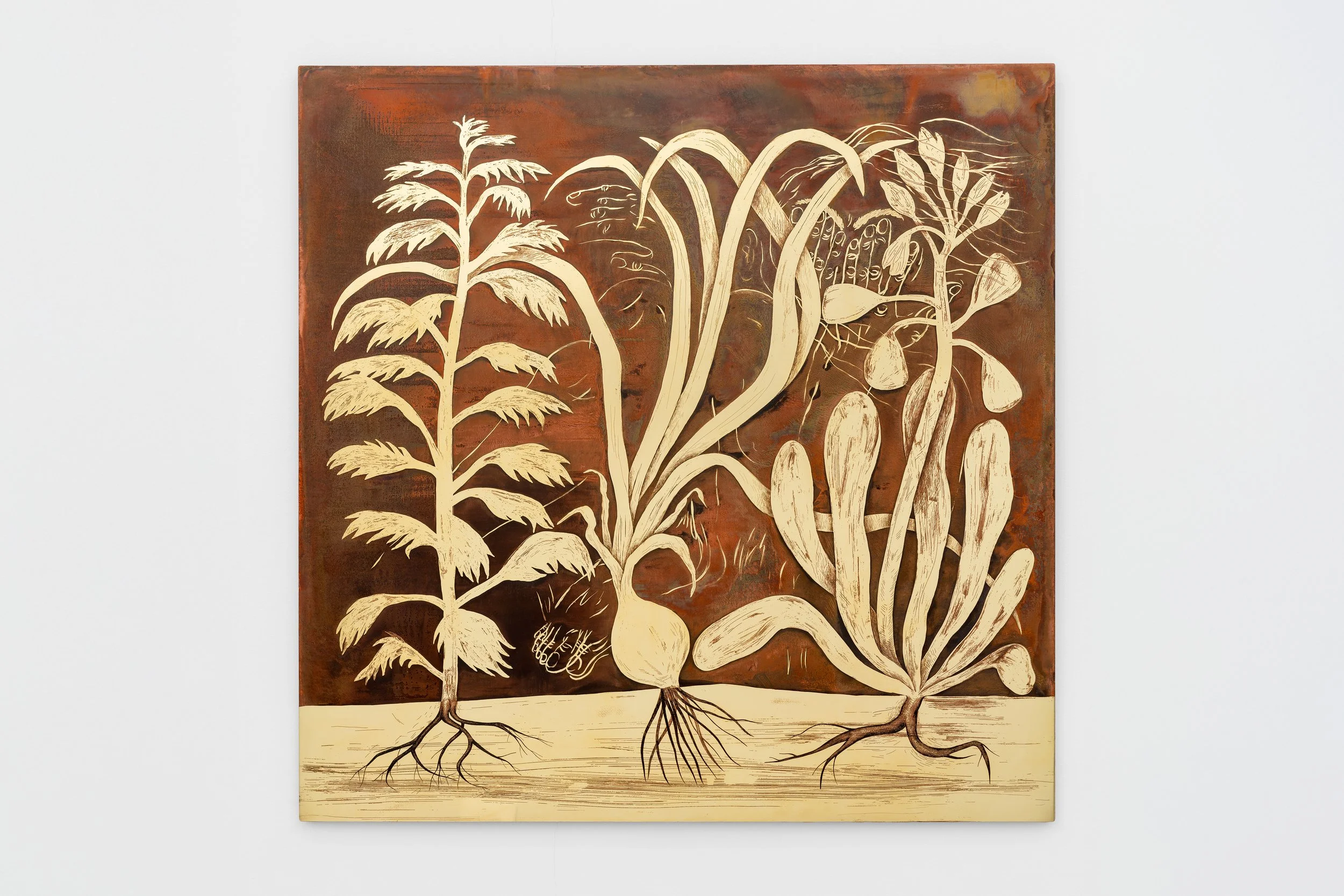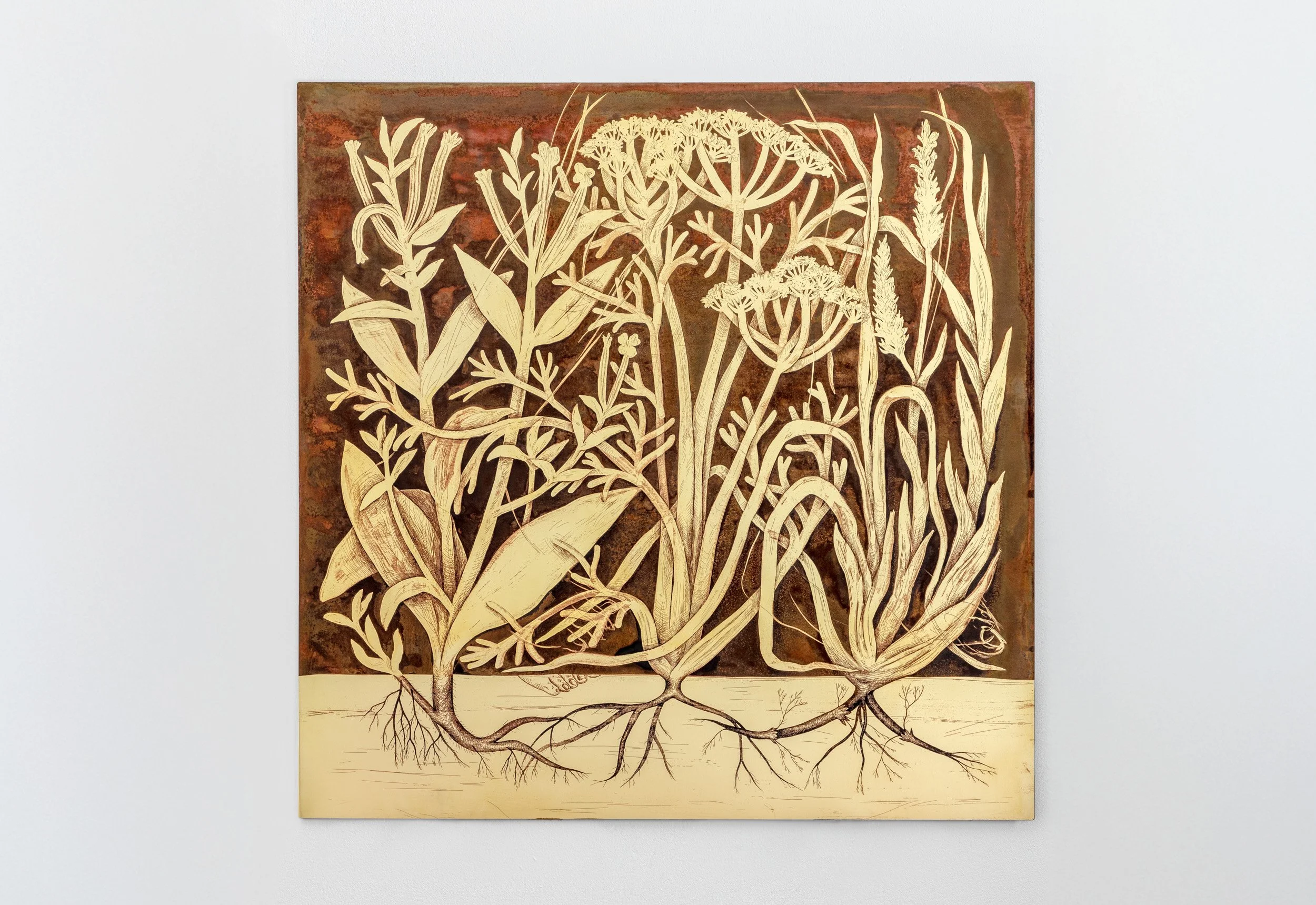 Isolation (1), 2025, acid-etched painting on brass, 100 x 100 cm